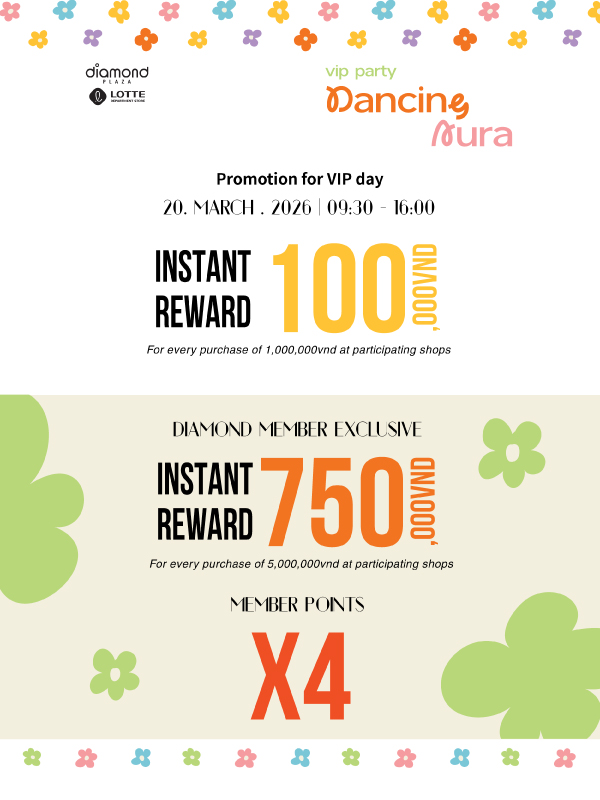 - Receive instant 01 Gift Voucher 750,000 VND with every purchase of 5,000,000 VND from participating stores.