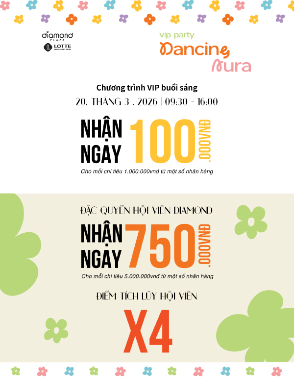 Cùng Diamond Plaza đón chờ Ngày Hội VIP Tháng 3 với những ưu đãi rộn ràng mà bạn chắc chắn không thể bỏ lỡ!