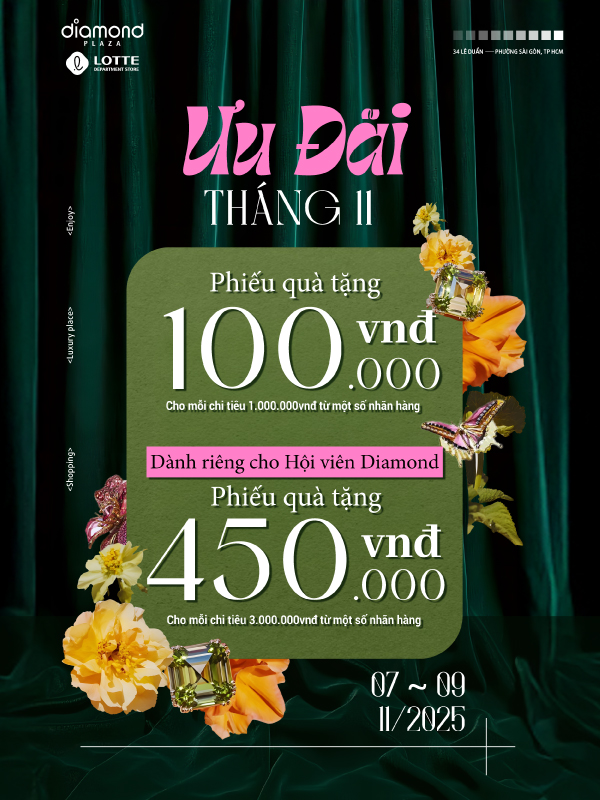 Trung tâm thương mại cao cấp đầu tiên và hàng đầu tại Thành phố Hồ Chí Minh, Diamond Plaza mang đến trải nghiệm mua sắm độc đáo với đa dạng mặt hàng, quy tụ các thương hiệu danh tiếng quốc tế hàng đầu.